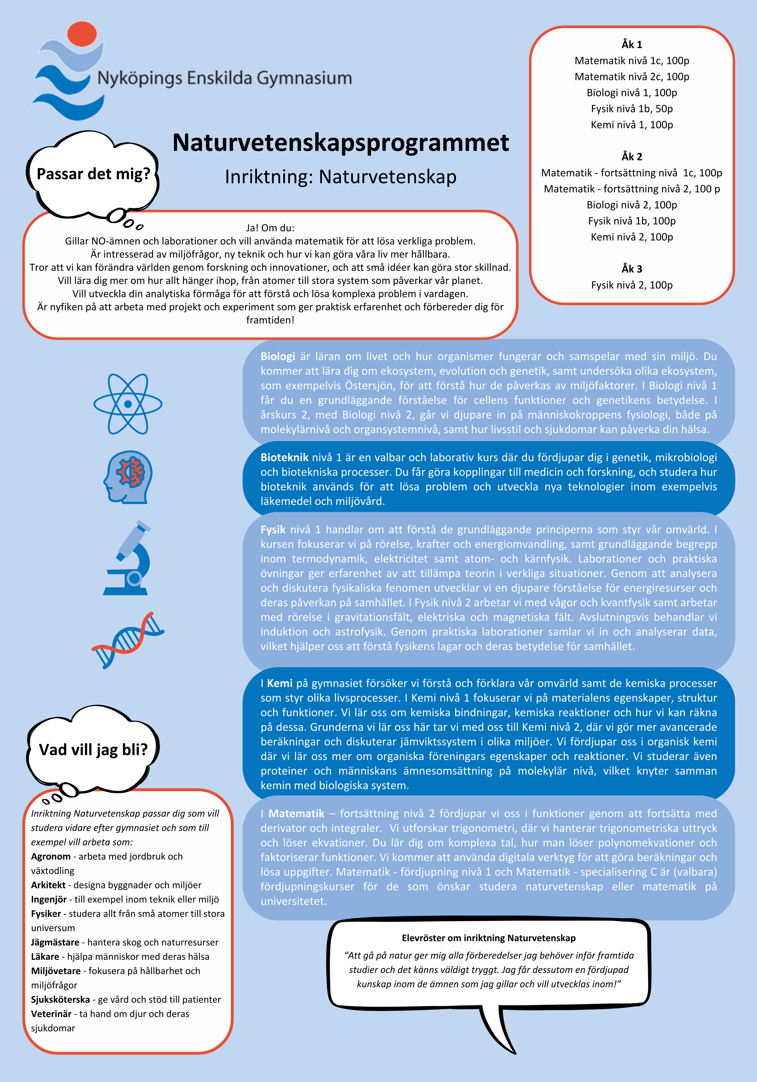 Naturvetenskapsprogrammet är ett högskoleförberedande program för dig som vill fördjupa dig i biologi, fysik, kemi och matematik, och förstå hur dessa ämnen hänger ihop. Naturvetenskapsprogrammet passar dig som är nyfiken på naturvetenskapliga frågor och ämnen.